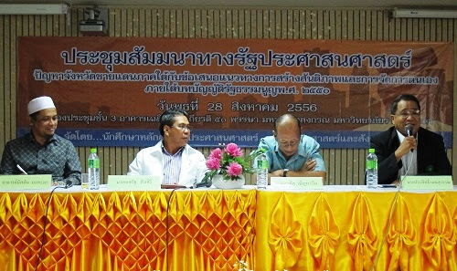 เมื่อวันที่ 28 ส.ค.56 ที่ห้องประชุมชั้น 3 อาคารเฉลิมพรเกียรติ 50 พรรษา มหาวชิราลงกรณ์ มหาวิทยาลัยราชภัฏยะลา มีการเสวนาและอภิปรายร่วมในข้อหัว “ความหวัง บทเรียน และความสำเร็จต่อการเจรจาสร้างสันติภาพในจังหวัดชายแดนใต้” จัดโดยนักศึกษาหลักสูตรรัฐประศาสนศาสตร์ คณะมนุษยศาสตร์และสังคมศาสตร์ มหาวิทยาลัยราชภัฏยะลา โดยมีนักศึกษาและนักเรียนและประชาชนเข้าร่วมฟังประมาณ 300 กว่าคน